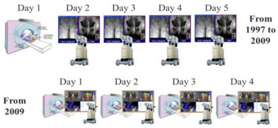 Starting in 2009, a dedicated high-dose-rate brachytherapy suite with large-bore CT scanner became available to treat patients within the same room. In this setting, one decade after the creation of the IGBT technique, the workflow was replaced with daily adaptive CT-based HDREBT (Figure 5) [17].