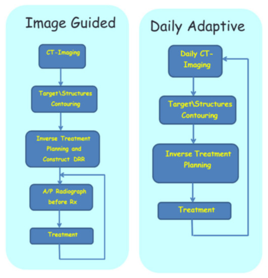 Adaptive image-guided HDREBT: top—workflow for image-guided brachytherapy (IGBT); bottom—workflow for daily adaptive brachytherapy.
