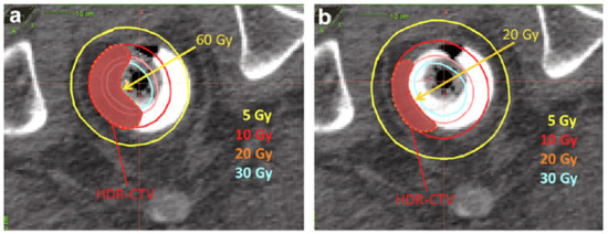 Role of the ipsilateral balloon on lowering the mucosa dose: (a) dose distribution without ipsilateral balloon—mucosa receives 60 Gy; (b) dose distribution with ipsilateral balloon—mucosa receives 20 Gy.
