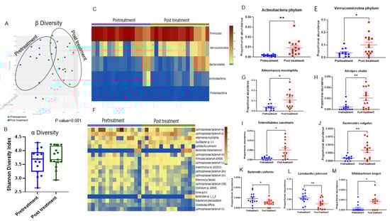 - Frugé, A.D.; Van der Pol, W.; Rogers, L.Q.; Morrow, C.D.; Tsuruta, Y.; Demark-Wahnefried, W. Fecal Akkermansia muciniphila Is Associated with Body Composition and Microbiota Diversity in Overweight and Obese Women with Breast Cancer Participating in a Presurgical Weight Loss Trial. J. Acad. Nutr. Diet. 2020, 120, 650–659. [Google Scholar] [CrossRef]