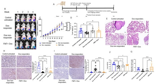 3.3. Modulating the Gut Microbiome by High-Fat Diet Fecal Microbiota Transplantation (FMT) Reduces Dox Efficacy