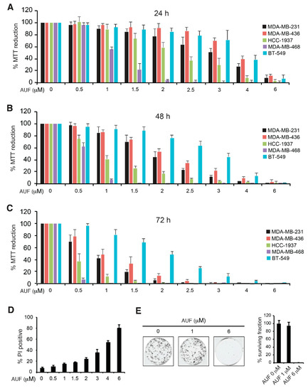 Cytotoxicity following AUF treatments. (A–C) Five TNBC cell lines were treated with AUF at indicated concentrations for 24 h (A), 48 h (B) and 72 h (C), and cytotoxicity was measured with the MTT assay. Bar graphs show the mean ± SD of at least three independent experiments. The percentage of MTT reduction was calculated relative to AUF non-treated cells (set as 100%). (D) MDA-MB-231 cells were treated with AUF at indicated concentrations for 24 h and stained with PI before proceeding to the cytometric analysis. Bar graphs show mean ± SD of at least three independent experiments. (E) Colony formation of MDA-MB-231 cells following treatment with AUF 1 μM and 6 μM for 24 h. The percentage of surviving fraction was calculated relative to non-treated cells.