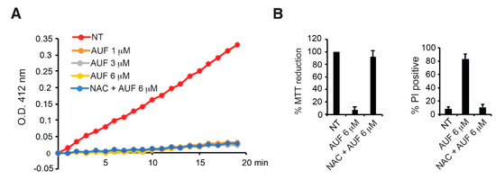 Inhibition of TrxR activity following AUF treatments. (A) Total TrxR activity of the cells with indicated treatments was measured, and one out of three independent experiments is presented. The time course of DTNB reduction was monitored at 412 nm over 20 min. OD at 412 nm of the first reading for each sample is set to be 0. (B) MDA-MB-231 cells were treated with 6 µM AUF alone or were pre-treated with 2 mM NAC for 1 h before adding 6 µM AUF. Cytotoxicity was measured with the MTT assay (left panel) and PI assay (right panel). Bar graphs show means ± SD of three independent experiments.
