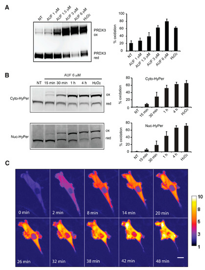 Intracellular ROS accumulation following AUF treatment has been observed in a number of studies [4]. We also previously observed that 6 µM AUF treatment appears to induce more severe oxidative stress in mitochondria than in cytoplasm [20]. To refine the evaluation of the redox alteration induced by AUF, the oxidation of mitochondria-localized PRDX3 was monitored in MDA-MB-231 cells treated by several concentrations of AUF. An increase in oxidized PRDX3 dimer was detectable upon treatment with 1.5 µM AUF for 30 min, while a predominant shift from reduced PRDX3 monomer to oxidized dimer was obtained after treatment with 3 and 6 µM for 30 min (Figure 3A and Supplementary Figure S1). We further analyzed dynamic cytoplasmic and nuclear H2O2 accumulation using H2O2-specific HyPer sensors transiently expressed in MDA-MB-231 cells. The oxidation status of cytoplasm-targeted cyto-HyPer and nucleus-targeted nuc-HyPer were monitored by a redox Western blot at different time points following the addition of 6 µM AUF to the cell culture (Figure 3B and Supplementary Figure S2). Prior to AUF treatment, HyPer sensors were in a highly reduced state. The oxidation of cyto- and nuc-HyPer was clearly visible after 30 min and continued to progress up to 4 h. To further refine the rapidity of HyPer oxidation, we followed the oxidation of cyto-HyPer in live MDA-MB-231 cells by confocal microscopy. The cells displayed a rapid and significant increase in fluorescence intensity, which was detectable 2 min after the addition of 6 µM AUF (Figure 3C). Although the fluorescence emission of HyPer sensor is pH-sensitive [28], it is highly unlikely that such a short exposure to AUF induced significant pH modification. It is of note that redox Western blot detection of oxidized and reduced form of HyPer is not pH-sensitive. Taken all together, the data indicate a rapid, massive and sustained intracellular oxidative stress as a very early event following the addition of a cytotoxic concentration of AUF.