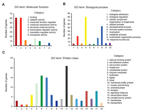 - Mi, H.; Muruganujan, A.; Casagrande, J.T.; Thomas, P.D. Large-scale gene function analysis with the PANTHER classification system. Nat. Protoc. 2013, 8, 1551–1566. [Google Scholar] [CrossRef] [PubMed]