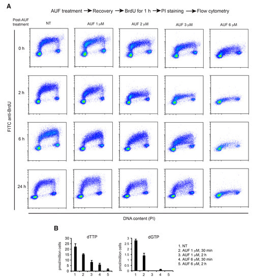 Effect of AUF on BrdU incorporation and on intracellular dTTP and dGTP levels. (A) MDA-MB-231 cells, non-treated (NT) or treated with 1, 2, 3, or 6 µM AUF for 1 h, were released in fresh medium. At 4 time points of post-treatment recovery (0, 2, 6, 24 h), these cells were labeled with BrdU for 1 h followed by PI staining and flow cytometry analysis. Representative graphs of three experiments are shown. (B) Intracellular dTTP and dGTP in MDA-MB-231 cells treated under indicated conditions. Bar graphs show mean ± SD of two independent experiments.