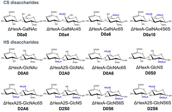 Deparaffination was followed by antigen retrieval in 100 mM Tris-HCl (pH = 7.6) for 30 min. The tumorous regions of the tissues and given parts of the BPH tissues were selected based on histological staining. The selected parts of unstained tissues were carved with a Gillette blade and digested with on-tissue digestion as described before [12,16]. For heparan sulfate (HS) digestion, a mixture of 5 mU heparin lyase I and 1-1 mU of heparin lyase II and III in 20 mM Tris-HCl (pH = 7.6), 2.5 mM Ca(OH)2, 10% glycerol solution was added in five hourly portions, and the digestion was run in a humidified box for 48 h. For chondroitin sulfate (CS) digestion, 25 mU of chondroitinase ABC in 20 mM Tris-HCl (pH = 7.6), 2.5 mM NH4OAc, 10% glycerol solution was added in five hourly portions, and the digestion was run in a humidified box for 48 h. The resulting HS and CS disaccharides were extracted from the surface via the repeated pipetting of 0.3% ammonia solution. The samples were dried down and purified in the TopTip graphite + C18 spin tip SPE system (Glygen corp., Columbia, MD, USA). The investigated disaccharides with their traditional names and Lawrence codes are represented in Figure 1.