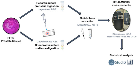 The molecular family of proteoglycans (PGs) can serve as potential new clinical markers. PGs are biomolecules containing one or more glycosaminoglycan (GAG) chains covalently attached to defined core proteins [6]. They can mainly be found in the extracellular matrix, on the cell surface, and in the granules found in the cytoplasm, thus exerting essential signaling functions [6]. The type, amount, and structure of the GAG chains play an important role in defining the physicochemical properties and biological functions of PGs along with the type of the core proteins. Therefore, their organization between distinct biological conditions is worth investigating. The two most prevalent classes of GAGs in tissues are chondroitin sulfate/dermatan sulfate (CS/DS) and heparan sulfate (HS). CS consists of the alternating units of N-acetylgalactosamine (GalNAc) and glucuronic acid (GlcA), while HS chains are built up of N-acetylglucosamine (GlcNAc) and glucuronic/iduronic acid (IdoA). The most common sulfation positions on CS chains are 4-O and/or 6-O positions of the GalNAc residues [3]. HS chains are subjected to a more complex sulfation cascade. First, N-deacetylase/N-sulfotransferase (NDST) enzymes act on the given domains of GlcNAc residues to generate N-sulfation, and then these domains are acted on by an epimerase to form IdoA residues. The subsequent sulfation reactions include the 2-O-sulfation of both IdoA and GlcA residues, the next 6-O-sulfation, and (rarely) the 3-O-sulfation of GlcNAc and GlcNS residues. GAG chains are responsible for cellular signaling and recognition, governed by the size and the sulfation pattern of the respective chains [7,8,9,10]. Alterations in the ratio of the differentially sulfated disaccharide building blocks may be descriptive of various diseases, e.g., sulfation pattern changes have been observed between healthy and cancerous tissues [11,12,13]. This structural variability also appears on the level of proteoglycans influencing signal transduction. For example, decorin (CSPG) is known to have major tumor suppressor effects, while perlecan (HSPG) plays a central role in both physiological and pathological angiogenesis [14]. Several functions of PGs have already been observed specifically in PCa as well; however, most of the structural and functional changes on both the PG and GAG levels remain to be investigated [15].