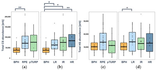 Total abundances of CS and HS chains in BPH and prostate cancer (PCa) tissues: (a) CS abundance in BPH and PCa tissues obtained via radical prostatectomy (RPE, n = 48) and palliative transurethral resection (pTURP, n = 6); (b) CS abundance in BPH and PCa tissues from low-risk (LR, n = 21), intermediate-risk (IR, n = 19), and high-risk (HR, n = 14) patients based on Gleason risk stratification; (c) HS abundance in BPH and PCa tissues obtained via RPE (n = 46) and pTURP (n = 8); (d) HS abundance in BPH and PCa tissues from LR (n = 20), IR (n = 17), and HR (n = 17) patients based on Gleason risk stratification. (*: p < 0.05, **: p < 0.01).