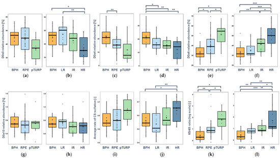 Considering these changes in the relative abundance of individual disaccharides, it is worth looking at the sulfation characteristics of CS. The average rate of sulfation was slightly higher on average in the RPE operation group than that in the BPH group. However, a larger interpatient variability was also observed. In the pTURP group, there were on average 14–16% more sulfate groups per disaccharide building block than in the other two groups (Figure 4i). The average rate of sulfation was lower in the low-risk PCa than in the BPH group, but it significantly increased with the increasing risk assessment, being especially high in high-risk PCa with a fold-change of 1.3 (p = 0.0022) between the LR and HR groups (Figure 4j).