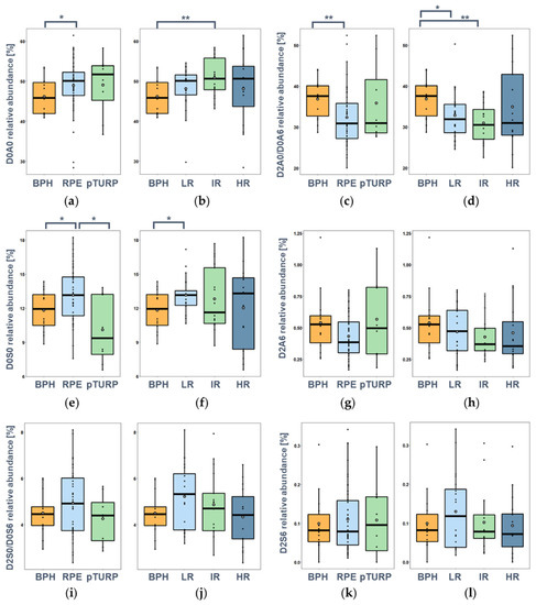 The largest differences between the sample groups could be observed in the relative intensities of the monosulfated components (Figure 4c–f). The D0a4 disaccharide showed a significantly higher relative intensity in the BPH group than in any of the PCa groups. Comparing the BPH group with the PCa groups with different surgical treatments, a significantly lower level was observed in the RPE group (p = 0.0054); however, the pTURP had even lower mean and median values than RPE; thus, the non-significance may be attributed to the low number of pTURP samples investigated and the high intragroup variance observed. Comparing the relative abundance of D0a4 in the case of the different risk groupings, the BPH group showed significantly higher D0a4 levels than the PCa groups (p = 0.0151, p = 0.0030, p = 0.0032, with LR, IR, HR PCa, respectively).