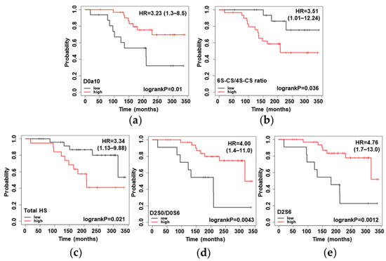 Kaplan–Meier plots of radical prostatectomy patients, based on the level of a given GAG motif: (a) D0a10 relative abundance; (b) 6S-CS/4S-CS ratio; (c) total HS abundance; (d) D2S0/D0S6 relative abundance; (e) D2S6 relative abundance. Low- and high-value groups were not further corrected for the Gleason score and pathological stage data. See Figure 1 for resolving the GAG structure codes.