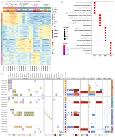 Gene expression data groups tumors with diverse genetic alterations that affect similar biological processes. Tumors were clustered in four groups (EX1–EX4) based on their resemblance to the four expression profiles identified by unsupervised analysis of the 10,000 most variably expressed genes (see methods). (A) Tumors (columns) of each expression cluster show upregulation of the genes (rows) of the corresponding expression profile compared to tumors of other expression clusters. Shown are the top 50 genes of each expression profile sorted by log2-fold change (l2fc). Tumors are annotated by their histological subtype. (B) Representative biological processes enriched in expression profiles (q-value < 0.05). (C) Oncoplot of tumors grouped by their expression cluster with alterations (left) and CN profiles with SVs (right), similar to Figure 1. The Oncoplot displays alterations affecting recurrently altered cancer genes, Wnt pathway genes and WT associated genes from Treger et. al. (2019) [7]. Alteration types: SNVs (purple) and SV breakpoints (light green), as well as nearby or overlapping SVs (dark green) and CNs (orange) in case of a gene expression change (nz-score >+/−1.98). The CNs and SVs are displayed for recurrently altered chromosomes 1, 8, 11, 12, 16 and 17, depicted as in Figure 1B. See Table S5 for gene alteration data and Figure S5 and Figure S6 for full sized figures.