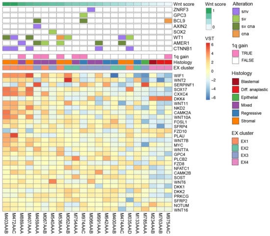 Biological processes reflecting aberrant kidney development are enriched in the expression profiles from both clusters EX1 and EX3. Cluster EX1 (n = 7 tumors) is characterized by increased expression of genes related to muscle cell differentiation, canonical Wnt signaling and mesenchymal stem cells and consists of tumors with stromal or mixed histology. In keeping with the expression pattern indicating Wnt pathway activation, this cluster contains all four tumors with co-occurring CTNNB1/WT1 mutations as well as three tumors without these characteristic mutations that instead carry a 1q gain (Figure 2C). Furthermore, 11p LOH or loss is most prevalent in EX1 (five out of seven tumors) and absent in EX3 or EX4 tumors. Cluster EX3 (n = 7 tumors) is enriched for terms related to early kidney development, cilia organization and other genes related to epithelium or apical membrane. The only tumor with epithelial histology is present in EX3 together with mixed and regressive tumors. Of note, three tumors show significantly reduced MIRLET7A expression (M459AAA, M974AAC, M066AAB), suggestive of a differentiation block leading to preservation of the progenitor state [8]. Some EX3 tumors carry mutations in Wnt pathway genes, which suggests that Wnt pathway activation could be present in both EX1 and EX3 tumors albeit via different genetic alterations.