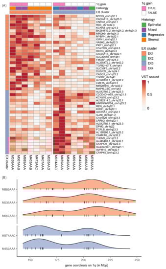 Gain of 1q is recurrent within EX1 and EX3 but associated with overexpression of different gene sets that reflect the biological processes characteristic for these clusters. We found that 1q gain is the underlying alteration for 48 of the 51 genes both recurrently altered and recurrently upregulated (Table S6). Since these genes are in the expression profiles of either EX1 (n = 26 genes) or EX3 (n = 22 genes), this suggests that 1q gain can have different effects on gene expression (Figure 4A). In the 1q+ tumors of EX1, the recurrently upregulated genes are associated with GO terms “striated muscle cell differentiation” and “muscle contraction” (e.g., MYOG, ACTA1, MYBPH, ACTN2, CACNA1S). In contrast, 1q+ tumors of EX3 upregulate genes associated with “kidney development” and “epithelial cell differentiation” (e.g., NPHS2, FLG, HRNR, REN). Furthermore, these EX1 and EX3 genes are distributed across the chromosome arm, and we did not observe preferential localization of either gene set (Figure 4B). This demonstrates that 1q gain can affect different biological processes even if the same region is altered among tumors.