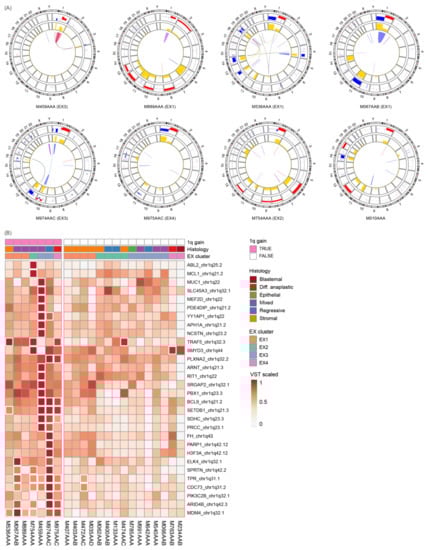 Previous studies showed that 1q+ is associated with poor prognosis and more prevalent in relapse [11]. However, our results indicate that both the underlying mutational mechanisms and the biological processes affected by 1q gain can greatly vary among tumors. Therefore, the prognostic value of 1q+ is likely dependent on the genomic context and combination with other mutations [11] and there have been conflicting findings among studies regarding the role of specific chromosomes in relation to clinical outcomes [11,13]. Haruta et al. reported that 1q+ co-occurring with 12+ was associated with a favorable prognosis and overexpression of candidate genes [13]. We also analyzed two tumors with 1q+/12+ and they each overexpressed a distinct set of genes with only ~5% overlap. Both M754AAA (EX2) and M889AAA (EX1) overexpressed MDM2, but M889AAA also overexpressed four other candidate genes on 12+ associated with a higher overall survival rate (BRAP, KDM5A, SFSWAP, ZCCHC8) [13]. So, whereas EX1 tumor M889AAA might have a better prognosis, this seems less likely for M754AAA despite both carrying an extra copy of chromosome 12. On the other hand, Gadd et al. reported not only a high prevalence of 1q+ in relapsed favorable histology WTs (75%) but also of 12+ and combined 1q+/12+ compared to primary tumors. However, they did not confirm the previously suggested link between 1p−/1q+ nor report candidate genes [11]. These apparently contradictory findings suggest that 1q gain by itself might not be sufficiently specific as a marker for poor prognosis. Here, we also described substantial heterogeneity in mutational mechanisms, genomic context and gene expression effects among individual 1q+ tumors. Our results suggest that gene expression needs to be incorporated along with 1q+ status for improved risk stratification.