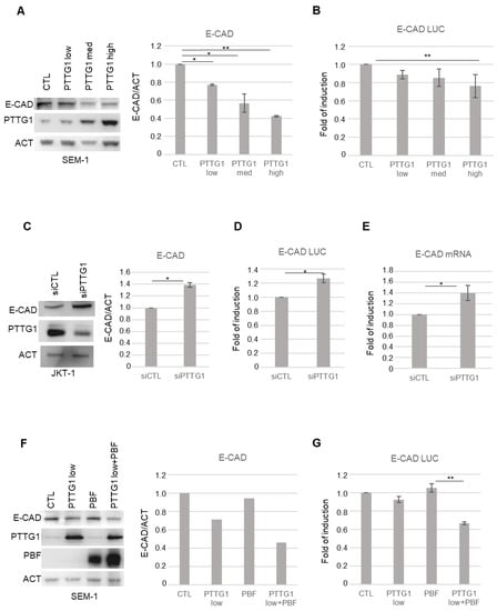 Initially, we overexpressed increasing doses of PTTG1 and analyzed E-CAD protein levels in SEM-1 cells (Figure 1A). Immunoblot analysis of whole-cell extracts showed that as PTTG1 levels increased, E-CAD levels significantly decreased (Figure 1A). The E-CAD decreasing trend upon PTTG1 overexpression was investigated using a luciferase reporter construct carrying −178/+92 E-Cadherin proximal promoter (E-CAD LUC) [35]. Figure 1B shows that an increasing amount of PTTG1 protein caused a gradual decrease of luciferase signal, suggesting that PTTG1 regulates E-CAD at the transcriptional level. To further demonstrate the repression of E-CAD by PTTG1, we depleted its expression in JKT-1 cells using small interference RNA (siRNA). The RNA interference of PTTG1 significantly upregulated E-CAD expression at both protein level and in terms of promoter activity (Figure 1C and D, respectively). Additionally, the decreased in PTTG1 level caused an increase in the endogenous mRNA levels of E-CAD in JKT-1 cells (Figure 1E).