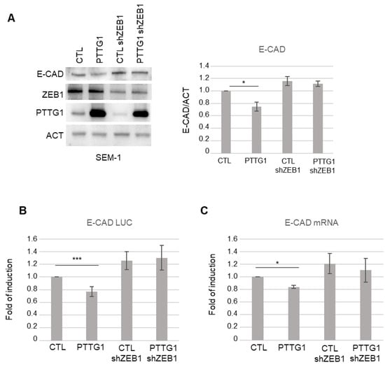 Since ZEB1 is a key element of a pool of transcription factors that control EMT [28] and represses E-CAD by binding to E box elements in its promoter region [35,36], we wondered if the effect of PTTG1 on E-CAD transcription is dependent on ZEB1 activity. To address this point, we analyzed E-CAD protein expression upon PTTG1 overexpression together with a simultaneous reduction of ZEB1 protein levels through short hairpin RNA of ZEB1 (shZEB1) in SEM-1 cells. Immunoblot analysis showed that PTTG1-induced repression of E-CAD was almost abrogated upon shZEB1 exposure (Figure 2A). This result was confirmed at the transcriptional level using both the E-CAD LUC reporter construct and the analysis of the endogenous mRNA levels of E-CAD (Figure 2B,C, respectively). Vice versa, PTTG1 significantly repressed E-CAD to a greater extent in the presence of ZEB1 overexpression in the luciferase assay (Figure S1). Taken together, these results suggest that PTTG1 represses E-CAD transcription via the ZEB1 protein.