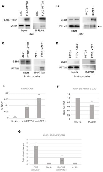 Overall, these experiments show that PTTG1 and ZEB1 directly interact and that this complex is simultaneously present on the E-CAD promoter.