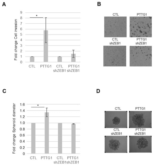 To this end, we made use of a Matrigel-coated transwell chamber assay. We measured the invasion rate of SEM-1 cells upon PTTG1 overexpression in the presence or absence of ZEB1. As reported in Figure 4A,B, PTTG1 overexpression caused a significant increase in the invasion rate of SEM-1 cells that was almost completely abolished by the shRNA of ZEB1. Importantly, such behavior was also confirmed in the sphere-forming assay (Figure 4C,D). Indeed, the increase of the sphere-forming ability caused by PTTG1 overexpression was rescued by the decrease of ZEB1 expression by shRNA (Figure 4C,D). These data indicate that the cooperation of PTTG1 with ZEB1 has a significant impact on cell growth/invasion properties involving the EMT process.