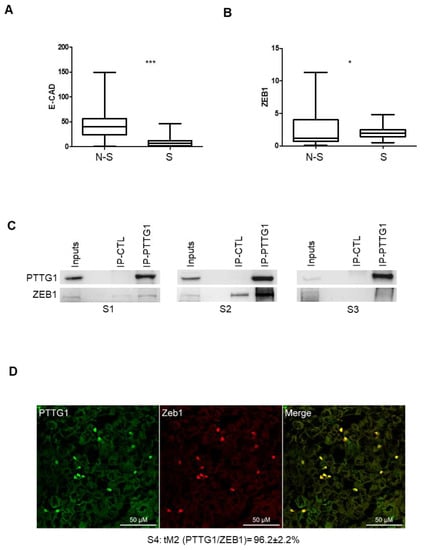 PTTG1/ZEB1 interplay in human seminoma specimens. (A) Box plot of mRNA levels of E-CAD in nonseminoma (N-S; N = 65) and seminoma (S; N = 68) specimens in Atlas database (https://www.proteinatlas.org/ENSG00000039068-CDH1/pathology/testis+cancer (accessed on 3 November 2021) (*** = p < 0.001)). (B) Box plot of mRNA levels of ZEB1 in nonseminoma (N-S; N = 65) and seminoma (S; N = 68) specimens in Atlas database (https://www.proteinatlas.org/ENSG00000148516-ZEB1/pathology/testis+cancer (accessed on 3 November 2021). (* = p < 0.05)). (C) Western blot analysis (Wb) of the indicated proteins. Inputs represent 1/20 of the total protein used in immunoprecipitation of control (IP-CTL) or PTTG1 (IP-PTTG1) in three different human seminoma specimens (S1, S2, S3). (D) Representative pictures of merged (yellow signal) confocal immunofluorescence analysis of PTTG1 (green signal) and ZEB1 (red signal) in a human seminoma specimen (S4). Quantification of the nuclear colocalization of PTTG1 and ZEB1, evaluated through the Mander’s t2 (tM2) coefficient and expressed as percentage is reported below. Scale bar is 50 μM.