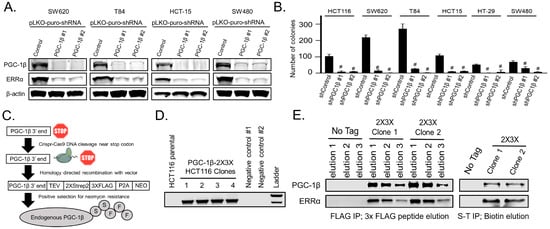 Endogenous PGC-1β interacts with ERRα, promotes ERRα expression, and increases anchorage-independent growth. (A) Lentiviral mediated transduction was used to express shRNAs for either a non-targeting control or two independent sequences targeting PGC-1β. The cells were lysed after 72 h and immunoblotted for PkfisGC-1β, ERRα, and loading control β-actin. (B) Colony formation in soft agar was measured after two weeks in cells infected with the same shRNAs from panel A. (C) Illustrative representation of the strategy used to knock in twin Strep2 and triple FLAG epitope tags onto the C-terminus of endogenous PGC-1β using CRIRSP-Cas9 mediated genome cutting with homology directed repair and neomycin selection. (D) Agarose gel showing PCR verification of correct genomic insertion of the epitope tags from part C in four clones of HCT116 cells. (E) HCT116 cells with epitope tagged endogenous PGC-1β were immunoprecipitated for either the FLAG or the Strep2 epitope and eluted with either the 3X-FLAG peptide or 50 mM biotin. Eluates were immunoblotted for PGC-1β and ERRα. # = p-value less than 0.001 when compared to the non-targeting control using one way ANOVA with multiple comparisons. S-T IP = Strep-Tactin immunoprecipitation.