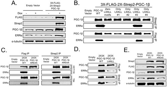 PGC-1 family proteins have been shown to use LxxLL amino acid motifs to bind transcription factors [9,10,11,12,13]. To determine the motif(s) required by PGC-1β to bind ERRα, we developed cell lines with inducible expression of N-terminus twin Strep2 triple FLAG epitope-tagged PGC-1β under doxycycline inducible expression from the AAVS1 safe harbor locus and found the increased levels of PGC-1β also causes a modest induction of ERRα protein levels (Figure 2A). We then made a series of PGC-1β mutant proteins to assess the role of each LxxLL motif in binding ERRα. To be in accordance with the previous labeling from the literature [14] we maintained the same labeling system: Motif 1 LLAEL (amino acids 92–96), Motif 2 LKQLL (amino acids 156–160), Motif 3 LRELL (amino acids 343–347), and Motif 4 LLSHL (amino acids 664–668). Technically, motifs 1 and 4 are reversed but we wanted to directly assess their role in ERRα binding since there is literature evidence to suggest these motifs may be functional in other PGC-1 family members [15]. Motifs were inactivated by mutating all leucines to alanines (LxxLL → AxxAA or LLxxL → AAxxA). Using this strategy, we created one quadruple PGC-1β mutant where all four motifs were inactivated (zero LxxLL motifs) and four triple mutants where only one LxxLL motif was left non-mutated (Only LxxLL motif #1, Only LxxLL motif #2, Only LxxLL motif #3, and Only LxxLL motif #4). The five mutant and wild type PGC-1β cDNAs were integrated into the AAVS1 safe harbor locus of HCT116 cells and the expressed proteins were immunoprecipitated using the FLAG or Strep2 epitopes in separate experiments. The eluates were immunoblotted for PGC-1β and ERRα and showed that the mutant PGC-1β that was functional at only the LxxLL motif #3 (LRELL) immunoprecipitated the same amount of ERRα as wild type PGC-1β (Figure 2B). To test the role of the LRELL motif, we made two additional mutants that had all three leucines mutated to alanines (LRELL → AREAA mutant) or the RE mutated to alanines (LRELL → LAALL mutant). The PGC-1β AREAA mutant cDNA was integrated into both HCT116 and T84 cells and tested against wild type PGC-1β. Loss of the leucines in motif #3 eliminated ERRα binding in both cell lines (Figure 2C). To test the role of amino acids RE in motif #3 on ERRα binding we generated a PGC-1β LAALL mutant cDNA that was integrated into HCT116 cells and tested against wild type PGC-1β. Mutation of amino acids RE showed only a partial loss of ERRα binding (Figure 2D). Lastly, we tested if the PGC-1β mutant that cannot bind ERRα could induce ERRα expression and found that the PGC-1β AREAA mutant was unable to induce ERRα expression compared to wild type PGC-1β (Figure 2E). Overall, these findings suggest that all five amino acids of the PGC-1β LRELL motif are required for optimal ERRα protein binding, which caused increased levels of ERRα protein.