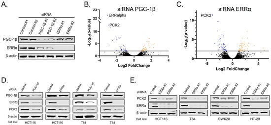 The genes regulated by PGC-1β and ERRα have only been examined in detail in breast cancer and normal liver tissue [16,17,18], but not in CRC. To determine which genes were regulated by PGC-1β and ERRα in CRC, we validated two siRNAs that targeted either protein (Figure 3A) and that loss of PGC-1β caused decreased levels of ERRα, but decreased levels of ERRα did not alter PGC-1β expression. To determine the genes regulated by PGC-1β and ERRα, we transfected HCT116 cells with siRNAs targeting either PGC-1β, ERRα, or non-targeting controls and collected total RNA after 72 h for RNA sequencing (Supplemental File S6). First, depletion of endogenous PGC-1β led to a dramatic decrease in ERRα mRNA, consistent with the model in the literature that binding of PGC-1 proteins to ERRα increases ERRα transcriptional activity by decreases inhibitory phosphorylation and that ERRα can bind to its own promoter to increase ERRα mRNA and protein levels (Figure 2E and 3B) [18,19,20,21]. Secondly, mitochondrial Phosphoenolpyruvate Carboxykinase 2 (PCK2) decreased the most after depletion of both PGC-1β and ERRα (Figure 3B,C). PCK2 is localized to the mitochondria and catalyzes the irreversible conversion of oxaloacetate (OAA) to phosphoenolpyruvate (PEP). Lastly, several other genes that regulate amino acid metabolism decreased after depletion of both PGC-1β and ERRα, suggesting that these two proteins cooperate to promote amino acid incorporation and metabolism to increase survival of colorectal cancer cells.