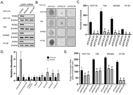 PCK2 promotes anchorage independent growth and glutamine utilization. (A) Colorectal cancer cell lines were transduced with lentivirus producing shRNAs targeting PCK2 and subjected to immunoblot after 72 h to confirm knockdown. (B) Representative photomicrographs of colonies in soft agar two weeks after shRNA mediated depletion of PCK2 in four CRC cell lines (C) Quantification of colonies from panel B. (D) Intracellular metabolites were measured by LC-MS/MS 72 h after siRNA-mediated depletion of PCK2. (E) Oxygen consumption rates were measured using a Seahorse XFe96 analyzer in colorectal cancer cell lines 72 h after shRNA-mediated knockdown of PCK2 using only L-glutamine as a substrate. * = p-value less than 0.05; ** = p-value less than 0.01, *** = p-value less than 0.001. # = p-value less than 0.001 when compared to the non-targeting control using one way ANOVA with multiple comparisons.