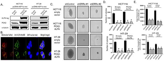 To assess if PCK2 can rescue the loss of ERRα activity, we developed a novel plasmid for stable PCK2 expression. PCK2 is anchored to the mitochondrial membrane at its N-terminus so we added an ALFA epitope tag [23] to the C-terminus and expressed it via a human EF-1α promoter in two CRC cell lines using neomycin selection (Figure 5A). We confirmed that the PCK2-ALFA protein was successfully localized to the mitochondria by performing direct immunofluorescence for the ALFA epitope using an ALFA epitope recognizing nanobody conjugated to Atto-488 and compared it to MitoTracker Far Red staining (Figure 5B).
