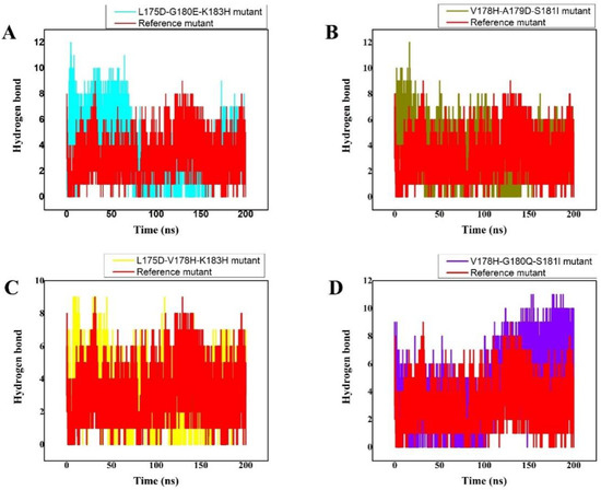 The number of generated hydrogen bonds in all systems was calculated to provide a more precise examination at the atomic level. The geometric requirements for a hydrogen bond are as follows: the hydrogen-donor-acceptor angle must be ≤ to 30°, and the donor-acceptor distance must be ≤ to 0.35 nm. If these two conditions are met simultaneously, a hydrogen bond exists. Hydrogen bonds are essential for the preservation of the secondary structure (-helices) of peptides and proteins [44,45]. The results of the time-dependent hydrogen bond study showed that all ten of the proposed peptide derivatives exhibited the strongest and best hydrogen-bonding networks with the K-Ras protein (Figure 3). It was seen that all of the constructed peptide/complex systems contain many hydrogen bonds compared with the wild-type complex, for example, the L175D-G180E-K183H peptide/K-Ras complex (Figure 3A). Our study’s findings suggest that the four developed peptides have strong, exceptional K-Ras binding capacity and may function as strong peptide inhibitors.