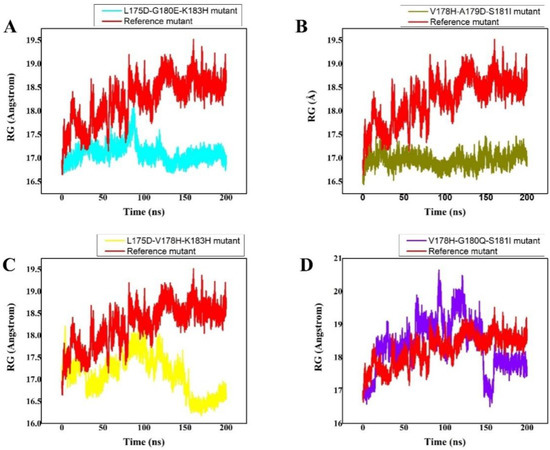 The size and compactness of the protein molecules are determined by the radius of gyration (Rg) [46]. Here, the Rg calculation was carried out to comprehend how the peptides maintained their physical integrity with the protein target throughout the simulation. The stability of the system is also determined by its compactness. The wild-type system had substantially converged Rg, as illustrated in Figure 4. Up until 40 ns of md simulation time, the Rg value was 17.5 ns; however, once this time had passed, the Rg of the wild type abruptly converged, and the Rg value rose to 18.5 ns. From 120 ns to 200 ns of time and strong fluctuations, the Rg value maintained 18.5. This demonstrates how unstable the wild-type system is; the peptide was likely released, and water entered the active pocket, decreasing the peptide binding. However, the L175D-G180E-K183H peptide/K-Ras system’s Rg remained constant, and the system displayed greater compactness. With an Rg value of 18 Å, slightly greater fluctuations were seen at 80 ns. Later, at 200 ns of simulation, the Rg value dropped to 16.8 Å, but generally, the system remained extremely compact, and the average Rg value was reported to be 16.8 Å (Figure 4A). Comparatively speaking, the V178H-A179D-S181I peptide/K-Ras system was less bulky than the wild type and L175D-G180E-K183H peptide/K-Ras. For the V178H-A179D-S181I peptide/K-Ras, the average Rg value was 16.9 Å (Figure 4B). The reduced Rg value demonstrates the peptide’s strong binding to the receptor. Between 150 and 200 ns, the L175D-V178H-K183H system remained compact, while between 0 and 150 ns, there were greater variations and unstable behaviour. For the L175D-V178H-K183H system, the average Rg was 16.9 Å (Figure 4C). Additionally, it was seen that the Rg value for the V178H-G180Q-S181I was 17.5 Å (Figure 4D). Except at the 150 ns mark, major fluctuations were seen throughout the entire experiment. In comparison to the wild-type system, the system had stabilised and was quite compact after 150 nanoseconds. These outcomes demonstrated that the planned peptides maintained their structural integrity with the active site residues during the course of the simulation. According to these findings, the designed peptides effectively bound to and inhibited K-Ras protein. Figure contains the Rg(s) for every system.