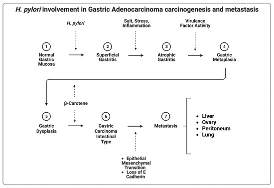 Human gastric carcinogenesis is a multi-step and multifactorial process. This process begins as superficial gastritis and progresses into atrophic gastritis, metaplasia, dysplasia, and then gastric adenocarcinoma, in a manner first described by Corea et al. in 1988 [82,83]. Constituent Wnt/β-catenin pathway activation via upregulated expression of Wnt10a and Wnt10b by H. pylori virulence factors has been identified as a common mutation that drives this progression [84,85]. Evidence also supports the activation of aquaporin-5 by CagA-positive H. pylori infection, which promotes epithelial–mesenchymal transition via the extracellular signal-regulated kinase/mitogen-activated protein kinase (MEK/ERK) pathway, thus laying the foundation for metastatic disease [86].