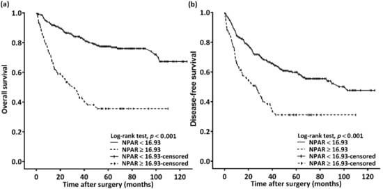 (a) Overall survival and (b) disease-free survival Kaplan–Meier curves for patients with oral squamous cell carcinoma classified on the basis of preoperative NPAR. Prognosis was significantly poorer in patients with an NPAR of ≥16.93. Abbreviation: NPAR, neutrophil percentage-to-albumin ratio.