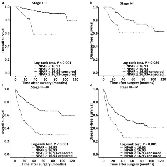 The Kaplan–Meier survival curve analysis showed that the estimated median DFS was 103 months in the patients with an NPAR of <16.93 and 27 (95% CI 15–39) months in those with an NPAR of ≥16.93 (p < 0.001, Figure 2b). Table 3 presents the associations between clinicopathological variables and DFS. DFS was discovered to be significantly associated with stage IV disease, PNI, LVI, poor cell differentiation, the need for CRT, and an NPAR of ≥16.93 in the univariate analysis. Poor DFS was independently predicted by stage IV disease (HR: 2.581; 95% CI: 1.504–4.428; p = 0.001), poor cell differentiation (HR: 2.030; 95% CI: 1.308–3.149; p = 0.002), and an NPAR of ≥16.93 (HR: 1.671; 95% CI: 1.142–2.444; p = 0.008) in the multivariate analysis. When the DFS curves were stratified by cancer stage and NPAR, we discovered that the patients in the low-NPAR group had better DFS than patients in the high-NPAR group (Figure 3b,d: stages I–II and stages III–IV; p = 0.089 and 0.001, respectively).