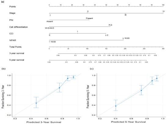 To provide physicians with a quantitative method for predicting three-year and five-year OS for a given patient, a nomogram incorporating the ostensibly significant factors identified in the multivariate analysis—overall stage, PNI, cancer cell differentiation, CCI, and NPAR—was established (Figure 4). For comparison, we also calculated the C-index of an AJCC staging-system-based nomogram; the C-index of this nomogram and that of our NPAR-based nomogram were 0.693 (95% CI: 0.665–0.721) and 0.784 (95% CI: 0.754–0.814), respectively. The AUC of the NPAR-based nomogram model was 0.793 (cutoff: 122; sensitivity: 77.5%; specificity: 69.8%). The calibration plots thus indicated favorable agreement between the nomogram’s three-year and five-year OS predictions (Figure 4b,c, respectively) and the actual survival outcomes. All these findings suggest that the NPAR-based nomogram has high discrimination ability and can provide accurate individualized OS prediction for patients undergoing OSCC surgery.
