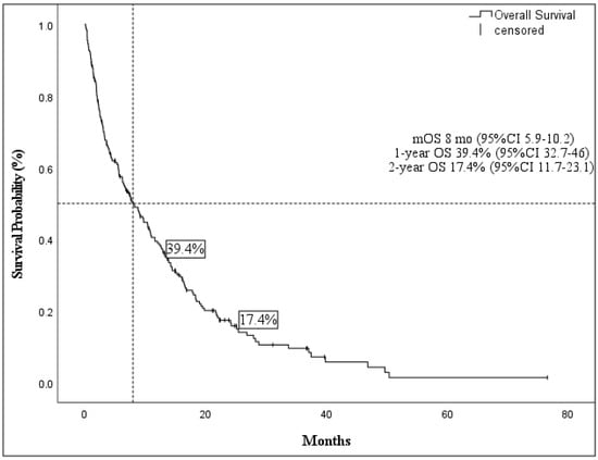 The median OS (mOs) was 8 months (95% CI 5.9–10.2), with 1- and 2-years OS of 39.4% (95% CI 32.7–46) and 17.4% (95% CI 11.7–23.1), respectively (Figure 1). Results of the Kaplan–Meier overall survival analysis are shown in Table 2.