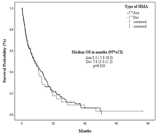 Baseline patients’ characteristics are summarized in Table 1. The median age was 78.2 years (IQR 75–86.2 years). Of the patients, 135 (61.4%) had de novo AML and 85 (38.6%) had secondary AML (s-AML). Among the s-AML group, 18 (8.2%) patients had a prior solid tumor (all of them had received chemotherapy or radiotherapy), while 47 (21.4%), 18 (8.2%) and 6 (0.8%) presented a previously documented myelodysplastic syndrome (none of them had received HMAs), a Philadelphia negative myeloproliferative disorder (all of them had received hydroxyurea treatment) and a non-Hodgkin’s lymphoma (all of them had received chemotherapy), respectively. The majority of patients (49.1%) had a CCI ≥ 3, with 88 patients (39.5%) who presented an ECOG ≥ 2. More than half of the patients (55.9%) showed an increased BMI (≥25) and 37 (16.8%) patients had a decreased eGFR (≤60 mL/min) at baseline. There were 49 (22.9%) patients who presented a documented infection at the time of diagnosis (12.7% pneumonia, 3.2% sepsis and 6.4% others), while 137 (62.7%) had a transfusion requirement of blood cells and/or platelets. Considering bone marrow blasts at baseline, 78 patients (35.5%) had blasts between 20–30%, 74 (33.6%) between 30–50% and 68 (30.9%) more than 50%. Among 198 patients with evaluable cytogenetic profiles, 86 (43.5%) had normal and 42 (21.3%) had complex karyotype (CK); 18 (9%) patients were chromosome 5 deletion carriers, while another 13 (6.5%) had monosomal karyotype (MK) for chromosome 7; and 15 (7.5%) patients harbored a trisomy of chromosome 8 and 24 (12.2%) patients had different alterations. A genetic risk assessment, according to the ELN recommendation, has been possible for 205 patients; among them, 17 (8.3%), 100 (48.8%) and 88 (42.9%) patients were stratified as low-, intermediate- and high-risk, respectively. Comparing the two HMA groups, patients treated with AZA were older than those treated with DEC (median age 78 years (IQR 76–82) vs. 77 (IQR 76–78), respectively, p < 0.001). The median WBC count at diagnosis was significantly higher for the DEC group (5.65 × 109/L (IQR 2.48–13.87) vs. AZA 2.62 (IQR 1.32–7.93), p = 0.002). No differences regarding the other disease characteristics and demographic data were observed among the two treatment groups. The median follow-up was 7.8 months (IQR 3.2–16.2) for the entire cohort.