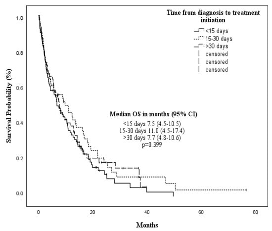 Median overall survival according to time from diagnosis to treatment initiation (≤15 days, 15–30 days, ≥30 days).