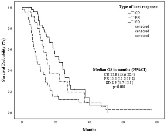 In addition, the type of response after the 4th cycle significantly influenced OS [CR mOS 19.5 months vs. PR 15.3 months vs. SD 8.9 months vs. progression of the disease (PD) 5.7 months, p = 0.011] (Figure 4), with no differences between CR and PR (p = 0.449). However, significant differences were observed comparing CR vs. SD (p = 0.008) and PR vs. SD (p = 0.043) after four cycles.