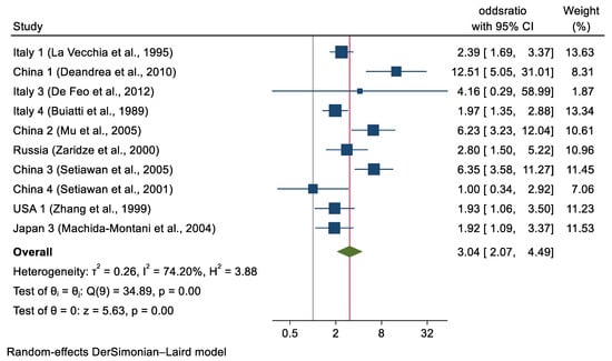 Controls were recruited from the same source of population and within the same enrollment periods as the cases, all without prior history of GC. In six studies [15,16,17,19,22,23], the controls were patients with various non-cancer diagnoses selected at the same health facility as the cases. The controls in the Japanese study were recruited from participants in a health checkup program [22]. Four studies [11,17,18,19] selected controls from the general population. In one study [18], 9% of eligible controls did not participate or were lost to follow up (See Table S1).