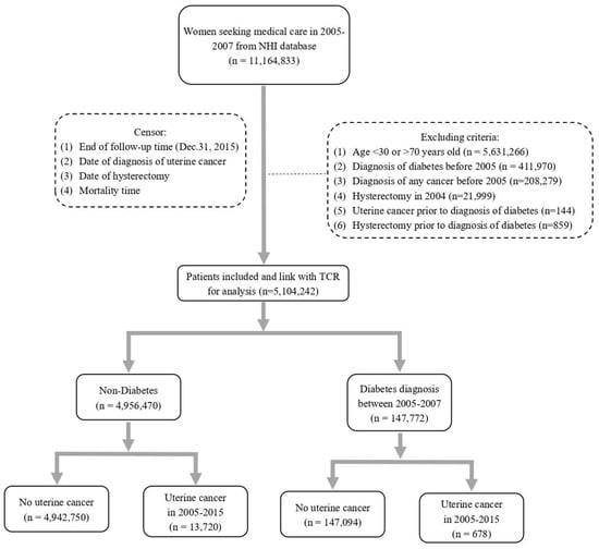 The information of the subjects was obtained from the National Health Insurance Database in Taiwan. This single-payer National Health Insurance Program was launched in 1995 and the entire population in Taiwan, nearly 23 million subjects, were enrolled in this program. Women aged between 30–70 years old from 1 January 2005 to 31 December 2015 were in this analysis. Women younger than 30 years were excluded to ensure that most of the DM were type 2, since the onset of type 1 DM occurs more frequently in people under 30 years of age. Women aged older than 70 years were excluded since most uterine cancers were diagnosed before 70. Additional exclusion criteria included: (1) subjects diagnosed with DM before 2005, (2) subjects diagnosed with any cancer before 2005, (3) women with a medical record of hysterectomy in 2004, (4) uterine cancer diagnosed prior to the diagnosis of DM, and (5) hysterectomy prior to the diagnosis of DM.