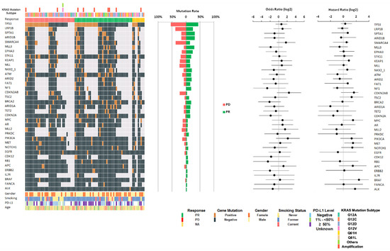 Consistent with previous findings in lung cancer, KRASG12C (32/87, 36.8%) was the most common mutation subtype in our study population, followed by G12V (19/87, 21.9%), G12D (18/87, 20.7%), G12A (6/87, 6.9%), and other mutations (Table 2, Figure 1 and [52]). There was more progression of the disease than the response in KRASG12D-mutated patients (Table 2, OR (95% CI) = 0.31 (0.09–0.95), p = 0.048); however, the association of a better OS with KRAS G12D mutation was revealed in the multivariate analysis, which indicated that KRAS G12D-mutated patients, especially those who had responses with immunotherapy, had a longer OS compared with patients who had other KRAS mutations (Table 3, HR (95% CI) = 0.09 (0.01–0.68), p = 0.02). KRASG12V mutations had a trend toward a worse OS but were not statistically significant (Table 2 and Table 3). Due to the limited sample size, our study included only one patient with a KRASQ61L mutation, who had progression of the disease. The samples sizes were also not sufficient to detect the statistical significance in other KRAS mutation subtypes, such as other uncommon codon 12, codon 13, and codon 61 mutations.