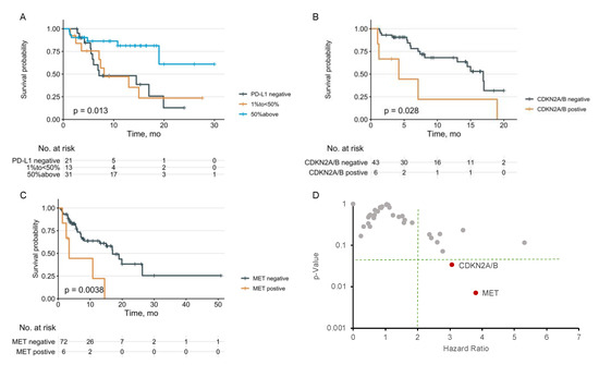 In the multivariate COX proportional hazards model analysis, we included PD-L1 status, genomic alterations (CDKN2A/B and MET) associated with OS by univariate analysis, and KRAS subtypes (G12D and G12V). We also included the demographic factors including gender, age group, and smoking status in the multivariate model. The multivariate analysis showed that PD-L1 remains statistically significant (HR (95% CI) = 0.12 (0.03–0.57), p < 0.01), as well as CDKN2A/B loss (HR (95% CI) = 9.44 (1.90–46.93), p = 0.006). The association of a worse OS with the KRAS comutation of MET (HR = 3.80 (1.44–10.05); p < 0.01; Figure 3C) was not retained in the multivariate COX proportional hazards model (Table 3, HR = 3.46 (0.55–21.91), p = 0.186). No statistical significance was found for age, gender, and smoking status with OS in the univariate analysis and multivariate analysis.