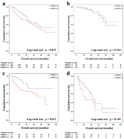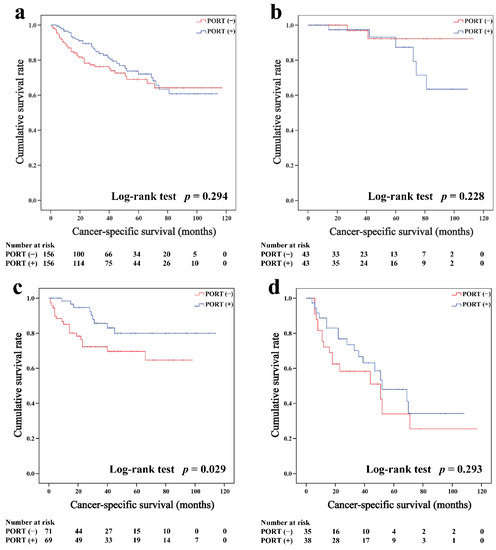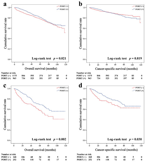 In the overall cohort, the average follow-up periods were 94.1 months (95% CI, 92.1–96.4 months, Kaplan–Meier estimate) for thymoma and 80.8 months (95% CI, 75.4–86.1 months) for thymic carcinoma. The Kaplan–Meier survival curves of the overall cohort according to the receipt of PORT are shown in Figure 1. For patients with thymoma, the PORT group had a better OS than the non-PORT group (five-year survival rates were 80.8 and 78.0%, p = 0.021, respectively; Figure 1a, but PORT was not associated with CSS before matching (87.3 and 88.4%, p = 0.819; Figure 1b. For patients with thymic carcinoma, both the OS (69.0 and 58.2%, p = 0.002; Figure 1c) and CSS (77.1 and 67.6%, p = 0.030; Figure 1d) of the PORT group were better than the non-PORT group.