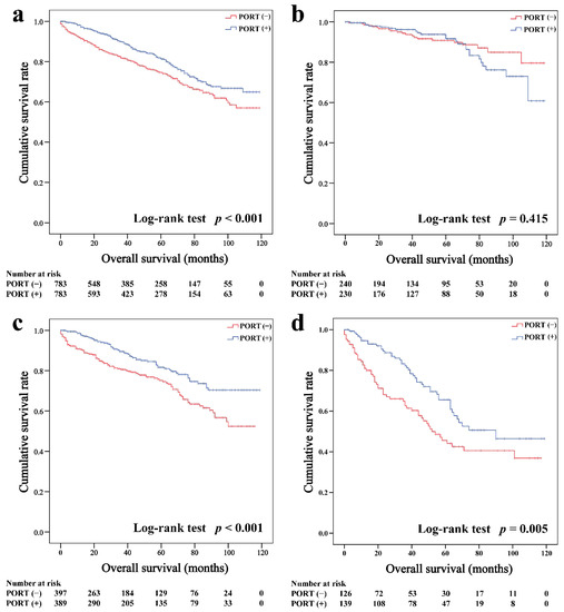 Categorical variables were analyzed using Pearson’s chi-square test or Fisher’s exact test, and continuous variables were analyzed using Student’s t-test. The Kaplan–Meier method was used to calculate the OS and CSS curves before and after propensity score matching between PORT and non-PORT groups. The log-rank test was performed to determine statistical significance. Univariate Cox regression analysis was used to determine variables associated with the OS and CSS of the matched population, and variables with a p-value less than 0.1 were selected for the multivariate Cox regression model. Hazard ratios (HR) with 95% confidence intervals (CI) were reported, and two-sided p-values less than 0.05 indicated statistical significance. All statistical analyses were performed using SPSS (version 27.0, SPSS Inc. Chicago, IL, USA).
