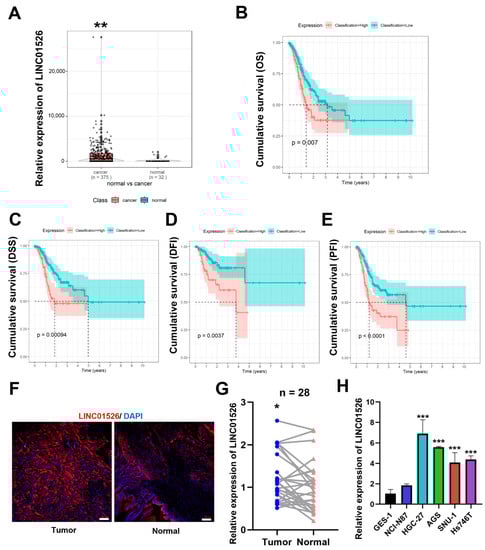 3.1. LINC01526 Is Significantly Upregulated in Human Gastric Cancer Tissues and Associated with a Poor Prognosis