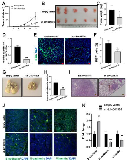 3.3. Knockdown of LINC01526 Suppresses Gastric Cancer Cells Growth and Metastasis In Vivo