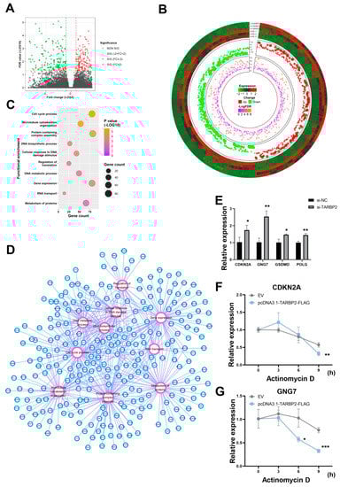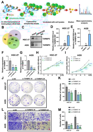3.4. LINC01526 Interacts with TARBP2, and TARBP2 Functions as an Oncogene in GC Cells