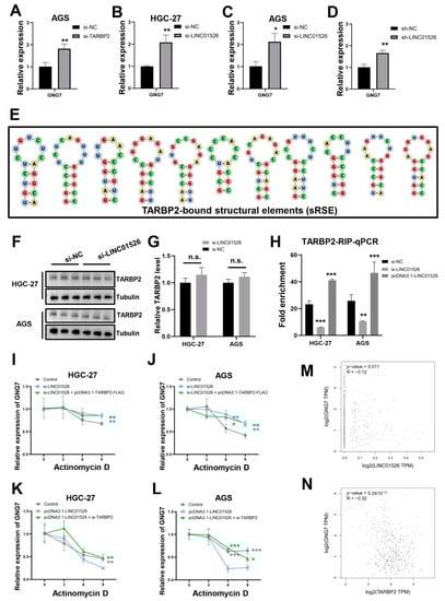 Chicago/Turabian StyleZhou, Jin-Yong, Jin-Yan Liu, Yu Tao, Chen Chen, and Shen-Lin Liu. 2022. "LINC01526 Promotes Proliferation and Metastasis of Gastric Cancer by Interacting with TARBP2 to Induce GNG7 mRNA Decay" Cancers 14, no. 19: 4940. https://doi.org/10.3390/cancers14194940